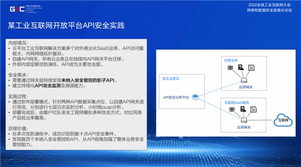 随后他讲到,作为数据传输的重要通道,API的日益普及,给数据安全带来了新的变化。从攻防角度看,攻击者的目标是企业数据,在主机安全/网络安全日趋成熟的情况下,与其穿透层层内网窃取数据本身(数据库),不如攻破数据的传输管道(API)更为方便。攻击者可以通过API后端应用漏洞、未授权访问、越权漏洞直接攻击API窃取数据。由于API在企业开发中的普遍应用,以及业务增速和安全的不对位,导致近两年来API安全问题导致的数据泄露事件频发。此外,2022 《工业互联网平台开放应用编程接口规范(征求意见稿)》的发布也表明,安全相关要求纳入工业互联网开放应用API标准,API安全受到越来越多的关注。
