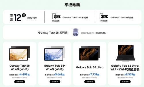 在学生的日常生活中,除了手机之外,平板电脑与穿戴设备也同样是标配之物。前者可以更好地完成课业任务,后者则能更便捷地监测与保持健康的状态。在“三星校园优惠”活动中,同学们同样在根据指引完成教育认证后,即可享受超值9折优惠,其中选购三星Galaxy Tab S8系列平板电脑,还可享至高12期分期0利率与获赠三星Galaxy Buds Pro蓝牙无线耳机;购买三星Galaxy Watch4系列则可享至高6期分期0利率与获赠官方运动表带的福利。