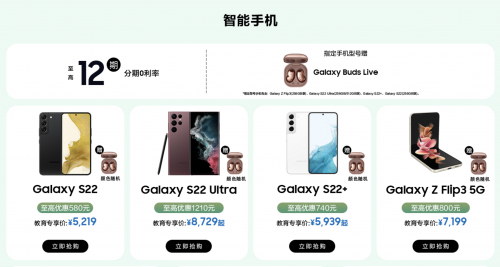 手机如今已经覆盖了我们生活的方方面面,特别是对于学生朋友来说,无论是学习还是生活,一款体验出色的智能手机将成为随身相伴的得力助手。在此次的“三星校园优惠”活动中,备受年轻人喜爱的三星Galaxy S22系列与Galaxy Z Flip3 5G迎来了超值校园优惠,即同学们在三星网上商城根据指引完成教育认证后,便可享受超值的9折购机福利与至高12期分期0利率。其中Galaxy S22系列至高优惠1210元,教育专享价5219元起,Galaxy Z Flip3 5G至高优惠800元,教育专享价7199元。除此之外,选购Galaxy Z Flip3 5G(256GB版)、Galaxy S22 Ultra(256GB/512GB版)、Galaxy S22+与Galaxy S22(256GB版)还可获赠Galaxy Buds Live蓝牙无线耳机。