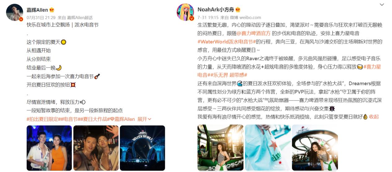 节目热播之际,《超感星电音》联合独家冠名喜力®啤酒在三亚打造喜力®星电音WaterWorld泼水电音节,DK德老师、FSHO_法兽、LUMINN、Lizzy4位电音制作人联手国内外多位优秀音乐制作人轮番登场,从白天到黑夜,从线上到线下,带给raver独一无二的电音节体验。这场喜力®星电音WaterWorld泼水电音节将节目内的电音狂欢延伸至节目外,让观众沉浸式体验电音氛围,也让喜力®啤酒成为暑期最热火的啤酒品牌。
