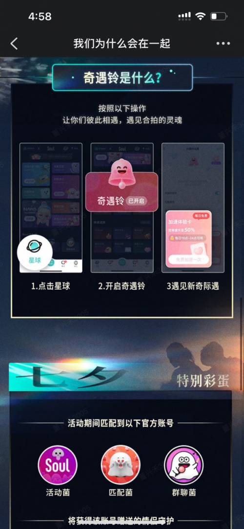 七夕期间,Soul发布一支名为《我们为什么在一起》的主题短片,捕捉生活中各种关系在一起碰撞出的美好瞬间。短片展现了年轻人对待亲密关系的不同见解和答案,从多种角度阐释了他们在一起的原因。