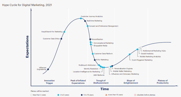 蔡芳表示,“ 中国相比海外,总体晚了3-5年。Gartner有一条曲线,在这条曲线里,国外的CDP已经是顶端往下落的态势,马上就到了该拐弯开始重塑CDP价值的阶段。中国则在偏顶端,刚刚往下一点点,处在早期客户体验过,总觉得CDP是万能,预期超高,回落到了开始理性看待的阶段,同时市场也还未形成较为明显的梯次。”
