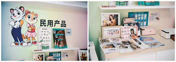 富士数码影像工坊中设立了四大区域,分别是面向专业商用领域 的ApeosPro C750 for Photo彩色数码多功能机,彩色相纸以及宽幅相纸;自助打印区域 的新型热升华打印机ASK400、中国首发的CX3240双面打印机;民用产品区域 的富士俏彩RC喷墨相纸、Princiao Smart小俏印二代便携照片打印机以及富士胶卷,以及包括相册、照片书和相框等在内的输出产品区域 。