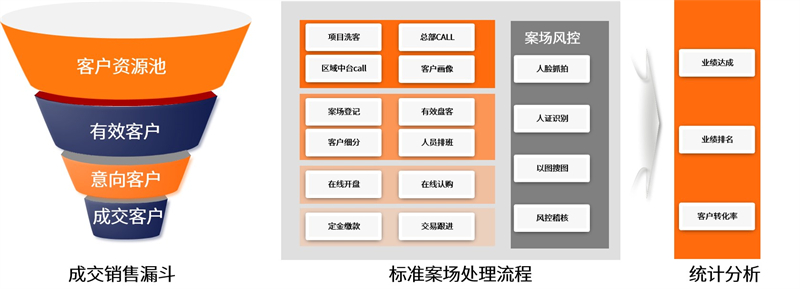 围绕案场销售漏斗,从客户资源池、有效客户、意向客户到成交客户,实现每一层的标准化、精细化案场管理,精准逼定,提升案场转化能力。