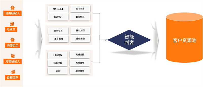 线下渠道多种营销活动并存,发力自由经纪人、老业主、内部员工、分销经纪人、自拓团队等多种角色引流获客,平台智能判客,真正做到“全民经纪人”,让每个场景都能获得有效客户信息。