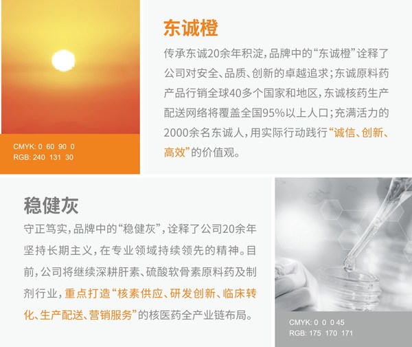 历经20多年的发展,作为肝素专家、核药先锋,东诚药业的原料药业务及核药业务均占据市场的重要地位。下阶段,公司将以原料药为基础,重点发展核医药板块,着力打造全产业链核医药生态圈。在此背景下,原有品牌形象已经不能完全支撑当下及未来发展规划。本次形象升级在传承的基础上进行的简洁化、国际化设计,表达了东诚在持续夯实化学药业务基础上,着力重点发展核医疗产业的长远规划。