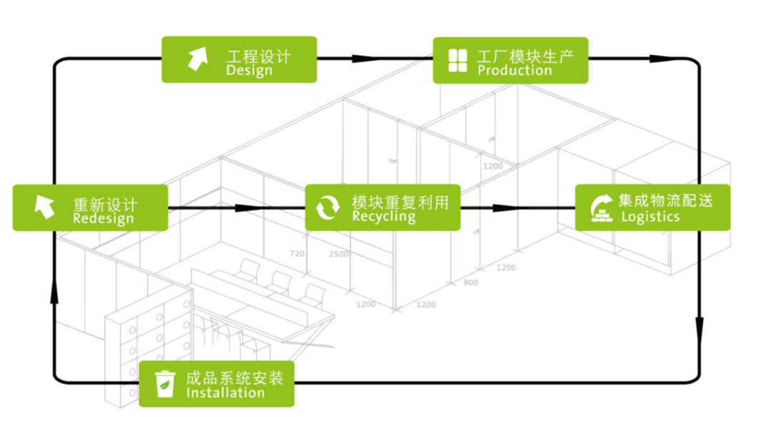 汉尔姆系统地研究了国内外传染病病房和普通病房的区别,病房空间采暖通风与空气调节的需求,以及医院平转疫过程收治病患时医疗动线的切换方案,提出了“工业设计+精密制造+数智建造”的总体思路,建立了平疫可转换病区的医疗工艺流程,通过无损承插式成套集成建造技术,实现了“平疫”医疗动线的快速转换,提升了基于信息化和数字化的全过程质量管控系统,形成了一套适于医院“平疫”功能转换的可快速安拆装配式内装集成技术,依据国标《绿色医院建筑评价标准》(GB/T 51153-2015),“可重复适用的隔断(墙)使用比例≥80%”,以及“可再利用建筑材料、可再循环建材适用比例≥15%”两项均获满分,可增加15分的加分,提高了绿色建筑的星级。