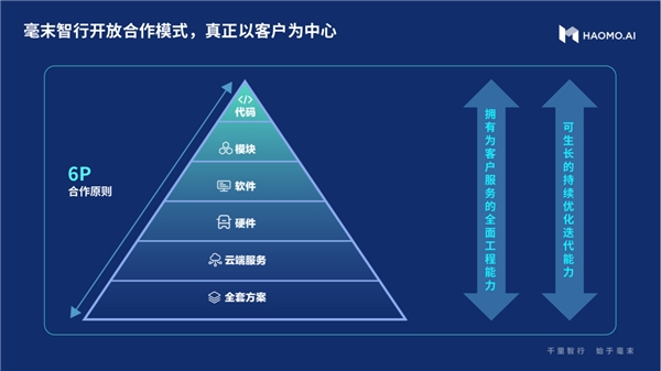 此外,在谈及实现自动驾驶的关键因素时,侯军表示自动驾驶科技公司成功的六要素是:技术、市场、资本、机制、人才和认知。在这六要素当中,未来成功的关键要素是机制。机制正确了,就可以解决技术、数据和资本等问题。在机制方面,毫末推出了“6P合作原则”,将提供从全栈解决方案到源代码之间的6个产品层面的合作方式。6P合作原则背后,是毫末基于现有的数据规模、增长速度和对数据的挖掘及理解,使之在具备可生长的持续优化迭代能力和为客户服务的全面工程能力的同时,能够为车企提供“源代码级的交付”。而在6P合作原则的冰山之下,是毫末近千人团队30个月的高强度研发与创新,百人核心团队在自动驾驶领域6-8年的厚积薄发,以及两年落地百万辆车的速度与底气,从而让毫末可以团结一切可以团结的伙伴、开放一切可以开放的能力。“我们希望能够真正以客户为需求,通过我们的能力持续为客户进行可生长的数据迭代优化。”
