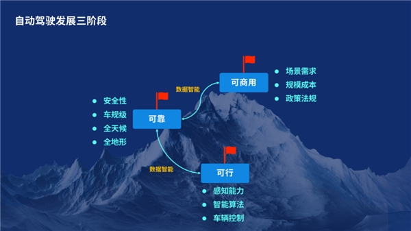 过去这一年,不仅是毫末在持续向前奔跑,整个自动驾驶赛道也获得了突飞猛进地发展。侯军认为,从城市导航辅助驾驶的落地和进阶的角度,行业内主要有三种技术路线:以特斯拉为代表的纯视觉技术路线、“视觉+激光雷达+高精地图”的传统自动驾驶路线,以及以毫末为代表的“视觉+激光雷达技术”路线,也就是“重感知、轻地图 ”路线。而“重感知、轻地图、大算力”恰恰也对应着自动驾驶有三个阶段,可行、可靠、可商用。对此,侯军在演讲中给出了解释:可行,代表了辅助驾驶系统的感知能力、智能算法、车辆控制;可靠,特指对于辅助驾驶安全性、车规级、全天候和全地形的要求;而对自动驾驶的钻研不仅是为了科研,最终目的是为了商用,需要考虑场景需求、规模成本、政策法规等问题。