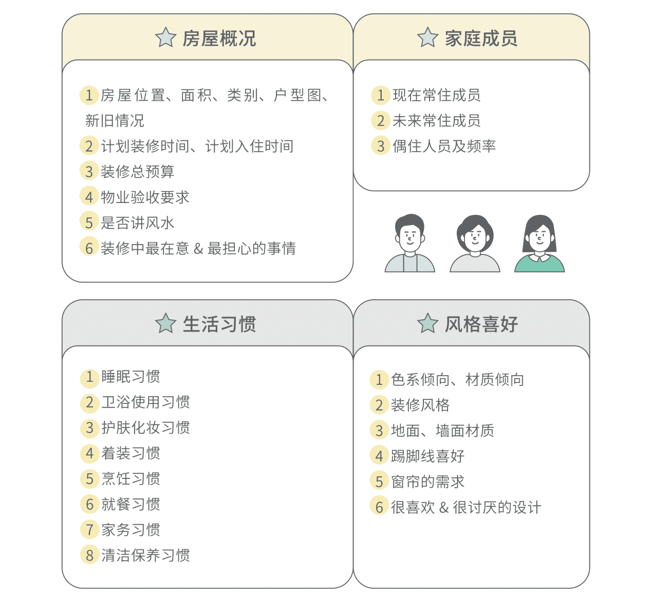 关于“未来的家长什么样”,你或许有很多想法和明确的画面,或者还比较迷茫没什么感觉。 不管你脑中家的模样是否清晰,都需要再细化梳理,并精准表达给你的“装修合伙人”。 这些“应该在装修前考虑的事”,可以帮助你尽可能全面地想清楚自己要什么,并协助合伙人一起装出一个更适合自己的家。