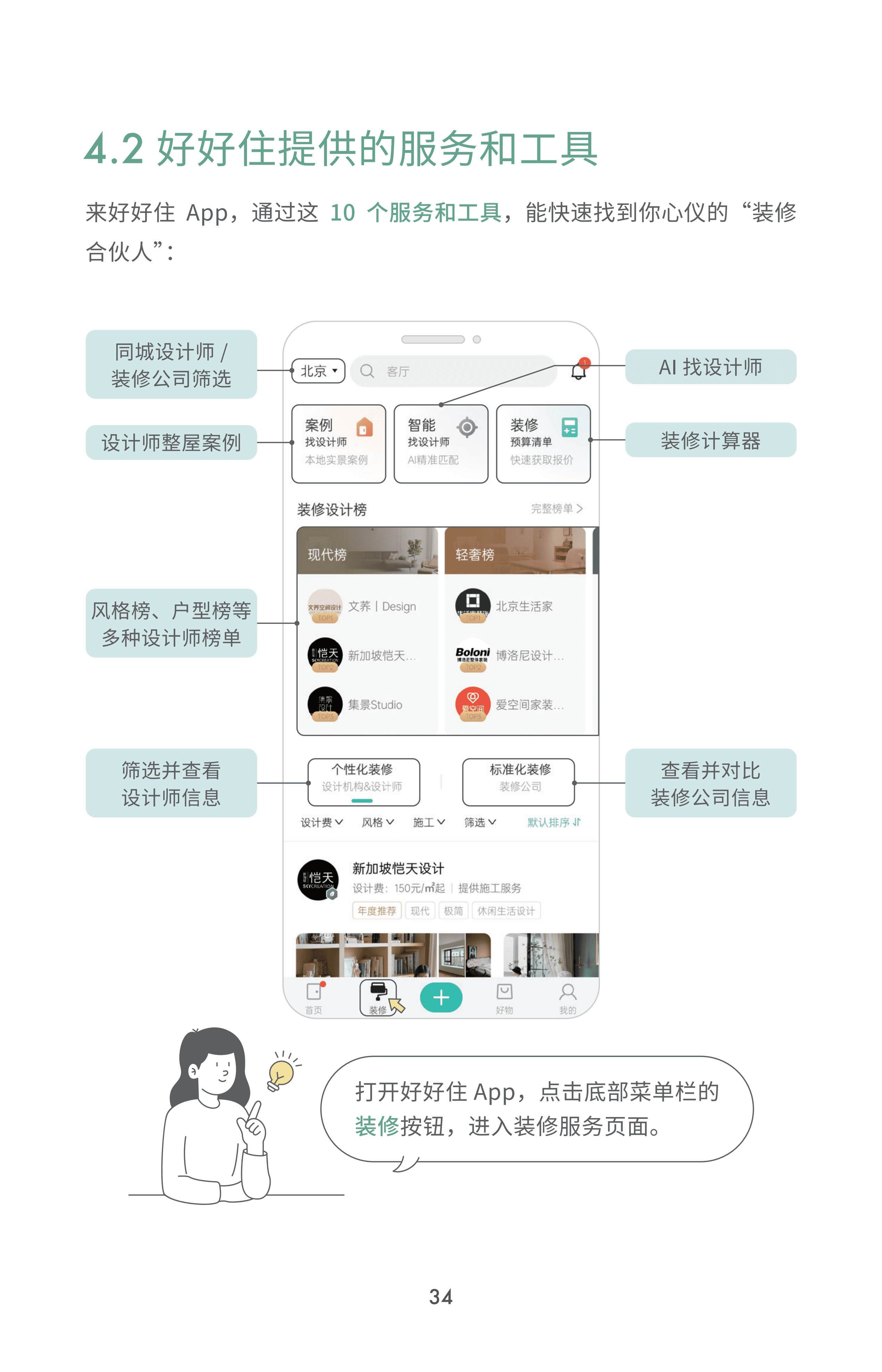 《指南》汇集了好好住App用户在找装修服务时面临的种种问题与决策难点,并参考了App内超5万名设计师和装修公司的服务流程及服务内容,最终凝练汇总出2种服务类别、4类居住形态、6大打分标准、8项需求拆解、10个服务工具,是一份权威专业的装修决策避坑攻略。