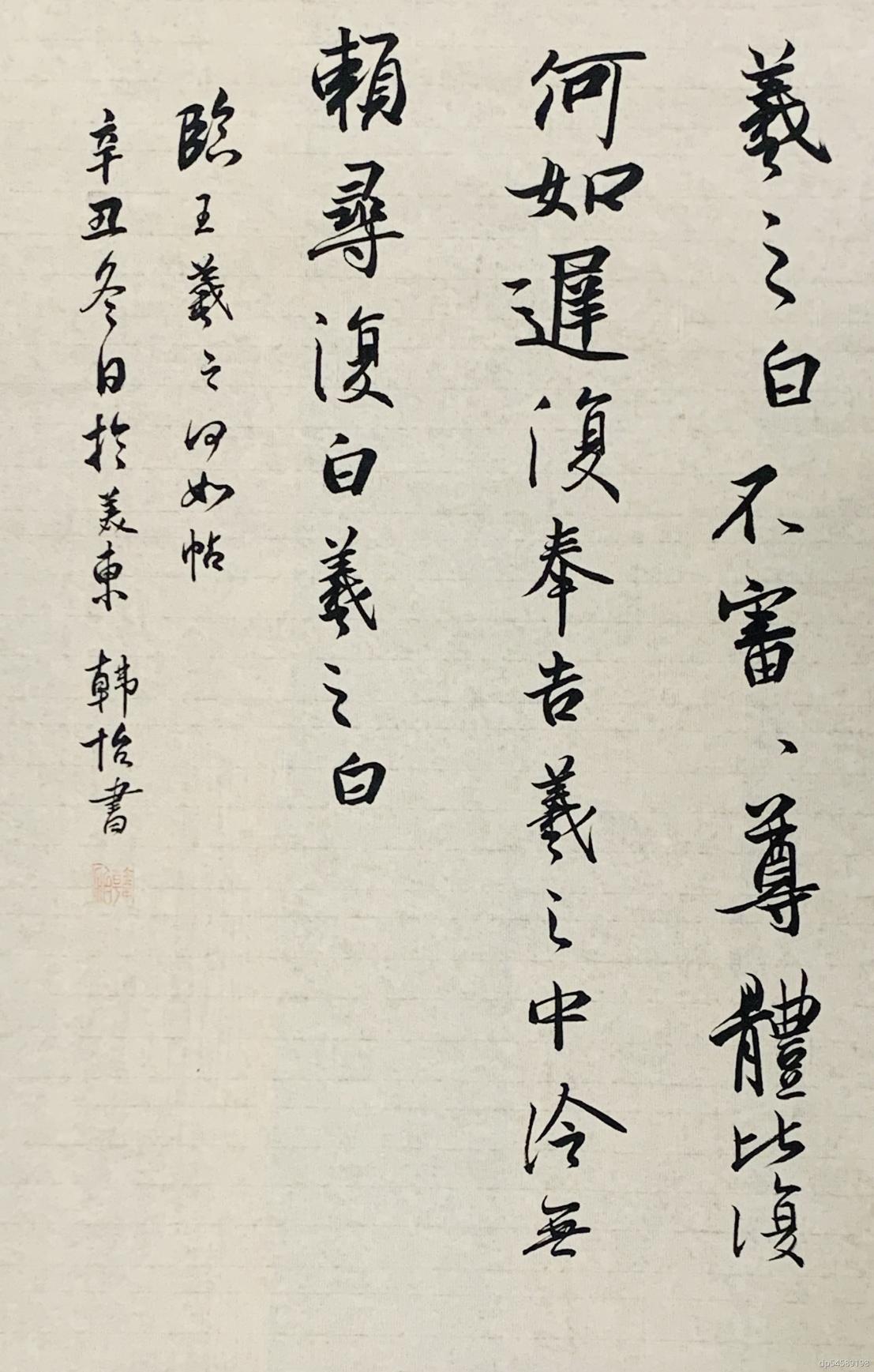 “无论如何,我一定要学书法”。有了这个念头后,韩怡回家找出了早年朋友母亲送她的一本颜真卿的《多宝塔》字帖,用邻居给的一支毛笔,开启了她的学书生涯。当时她的决心很大,立志要每天都要临习。但由于工作的原因,加上缺乏专业指导,在坚持了一个月以后,韩怡还是无奈的暂时放弃了书法学习。