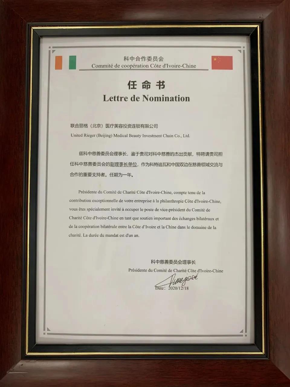 李滨董事长作为中国的有爱心的企业家代表,共同参与发起成立了“科中慈善委员会”,并被授予“科中慈善委员会慈善大使”的荣誉称号,联合丽格(北京)医疗美容投资连锁有限公司被任命为科中慈善委员会副理事长单位。期间,李滨董事长受到科特迪瓦驻华大使多索·阿达马阁下及其夫人约瑟芬·多索女士的亲切接见和合影留念。