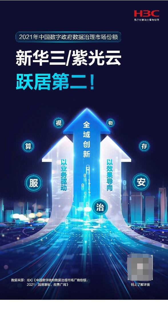 近日,国际知名的市场调研机构IDC发布了最新的《中国数字政府数据治理市场厂商份额,2021》,紫光股份旗下新华三集团和紫光云以全方位、端到端的数据治理能力和服务,以及在数字政府创新变革中的广泛实践,在推动政府数据治理和应用方面取得了出色成绩,以5.9%的市场份额位居中国市场第二位,展现了新华三在赋能数据资源开发利用,推动政府治理体系和治理能力现代化上的实力与价值。