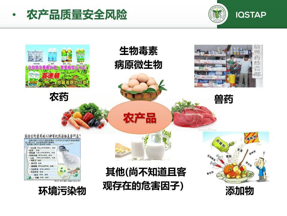 农产品的质量安全风险现在呈多元化趋势。以往果蔬的问题基本和农药残留及重金属有关,而畜禽往往都和兽药抗生素有关,但现在因为多渠道暴露环境,天然微生物的影响,产生了很多不同来源的危害因素。
