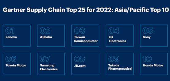 数据研究机构Gartner日前公布了2022年亚太区供应链10强榜单排名,其中,联想集团成为排名最高的企业,阿里排名第二,台积电排名第三。此外,上榜的企业还包括LG电子、索尼、三星电子和京东等公司。