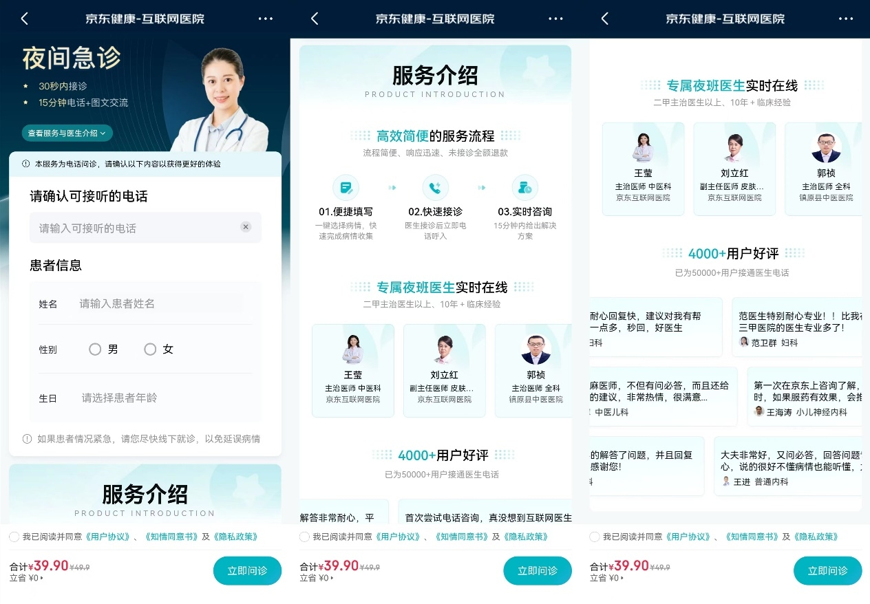 据了解,京东健康“夜间急诊”服务聚焦夜间问诊场景,通过在晚20点至次日7点期间安排医生值班,确保在夜间能高效快速提供医疗服务。用户可直接在服务页面填写相关信息后,值守医生将为用户提供电话问诊服务。在问诊结束后,用户还可以通过京东健康“药急送”,获得平均30分钟送药上门的购药服务。