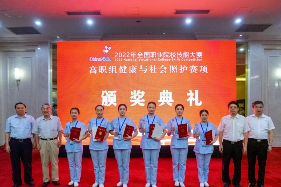 本次大赛高职组健康与社会照护赛项荣获一等奖的是苏州卫生职业技术学院刘喜和天津医学高等专科学校任玉莹等6人;潍坊护理职业学院崔晨晨和长沙民政职业技术学院李慧娟等12人荣获二等奖;广州卫生职业技术学院吴家涛和福建生物工程职业技术学院邹贞等18人荣获三等奖。同时为获得一等奖参赛选手的指导教师颁发优秀指导教师证书。