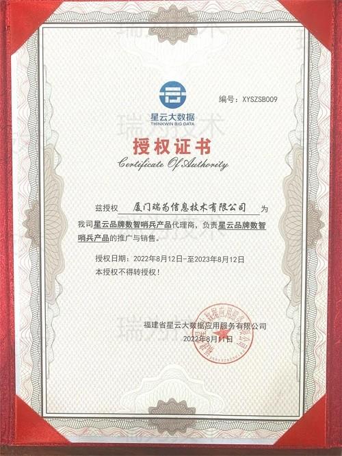 同日,在福州,福建省星云大数据应用服务有限公司举行“数智哨兵”星云品牌入围厂商授权仪式颁发授权证书,自此,瑞为技术正式成为星云品牌数智哨兵产品代理商。