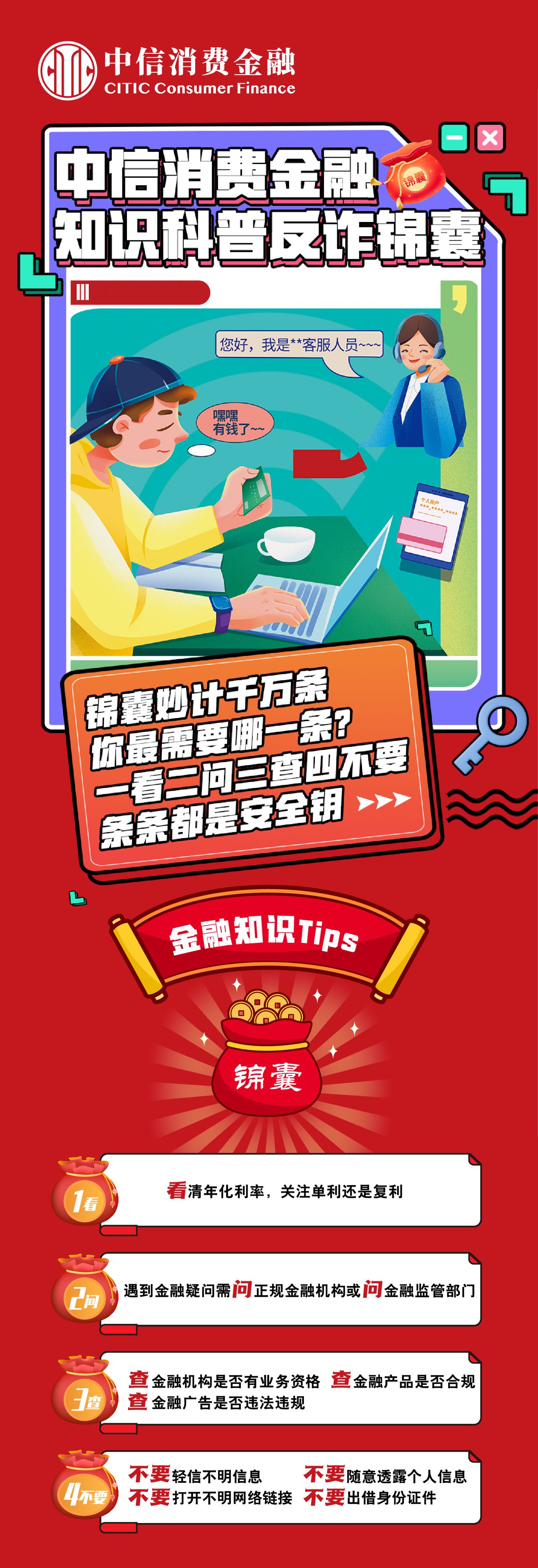 诱导“非法代理维权”、冒充客服注销贷款……近年来,很多不法分子将“黑手”伸进对金融知识了解较少的年轻群体,让很多不明真相的年轻消费者掉进了金融诈骗的陷阱。面对年轻人金融安全知识缺乏、防范意识差的现状,中信消费金融在“2022年金融知识普及月”中,重磅上线“中信消费金融「金融知识科普反诈锦囊」”,为年轻消费者填补金融知识的短板,有效防范针对年轻人的非法金融活动,为他们筑牢金融反诈防火墙。