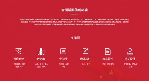 在系统运行环境方面,华天动力信创OA系统也做到了全面调优适配国内主流软硬件,包含了芯片、整机、操作系统、数据库、中间件、浏览器、流版软件、身份认证、电子签章等各个核心模块,能够在国产化的环境中稳定运行、流畅使用,共与50余家知名信创企业成功适配,携手打造安全高效的信创生态环境。