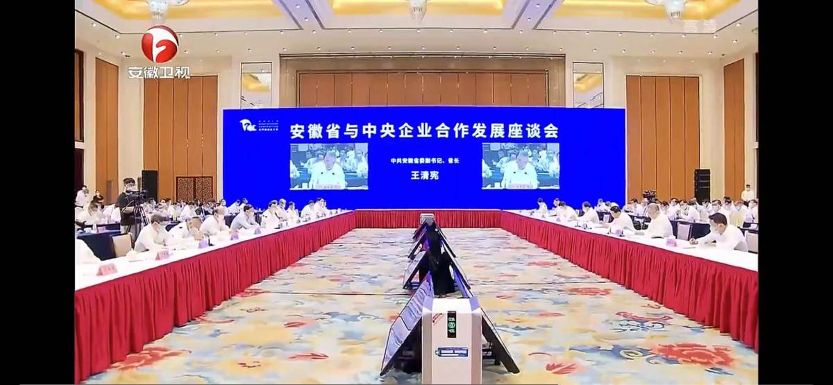 在大会开幕式暨主旨论坛现场、安徽省与中央企业合作发展座谈会上随处可见“白墩墩”“绿墩墩”,为本次大会防疫做好有力支撑。在大国制造展上,安徽省经济和信息化厅副厅长柯文斌一行莅临会展中心2号馆中国电科展区参观AOE空气消毒机。