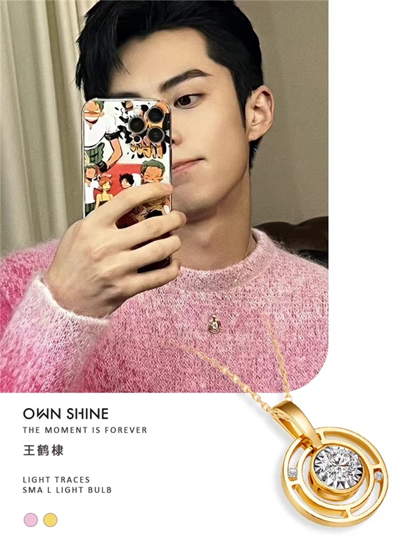 王鹤棣身穿一件粉色渐变毛衣,脖子中的项链堪称点睛之笔,盐酷boy上线,个人气质也因此得到了极好的呼应与契合。而在OWN SHINE慕璨光之轨迹系列中,小灯泡项链主钻采用了车花片的工艺,将项链的钻石视觉效果拉满,足以让佩戴者成为各方瞩目的焦点。在设计细节上,小灯泡项链极为注重人性化元素,其吊坠可以自由活动,链条也可以根据喜好调成中长链或短链,这样的设计风格也是OWN SHINE慕璨为了强化珠宝穿搭时尚效果的匠心理念。