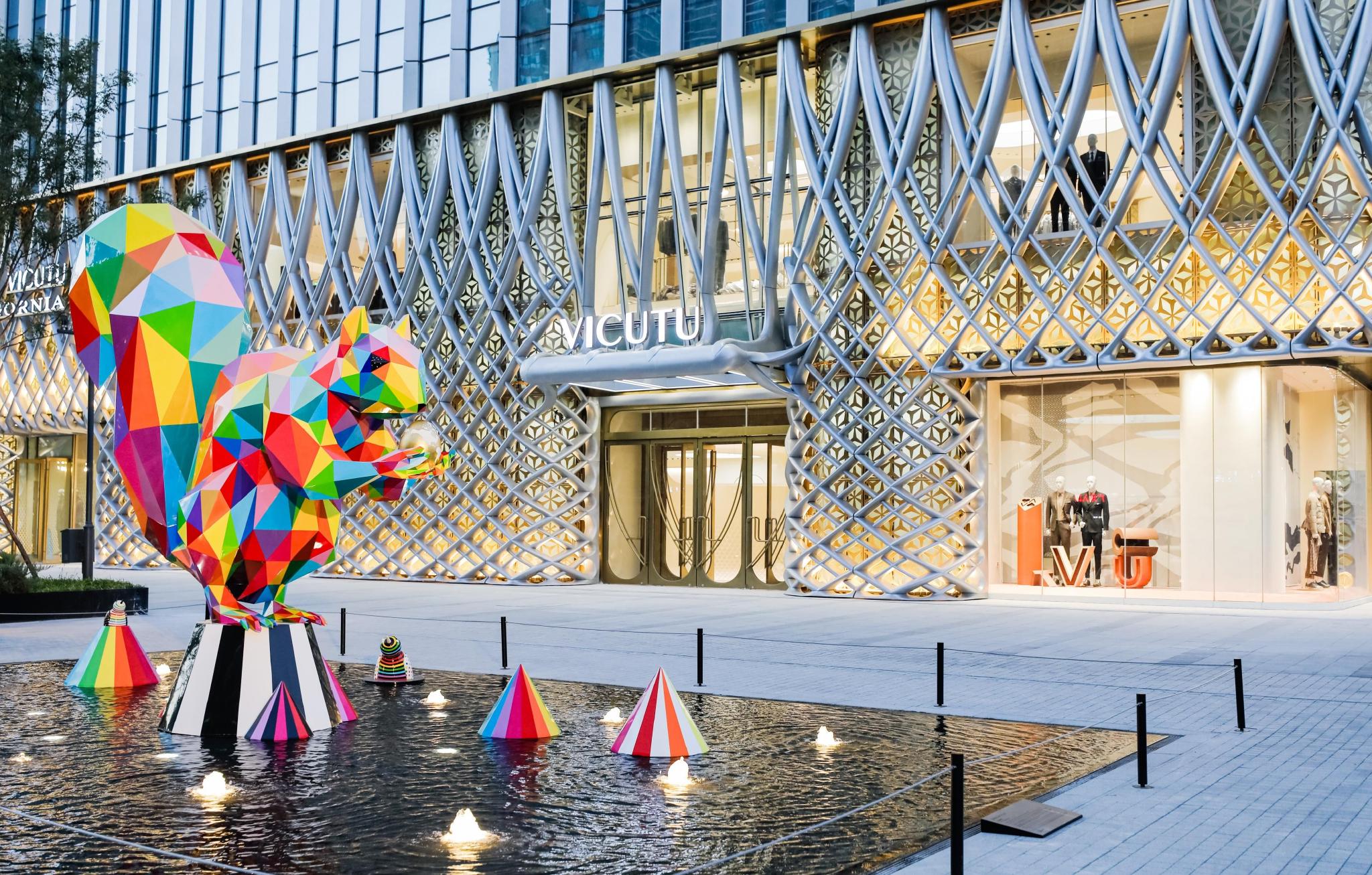 在旗舰店外的广场,一只五彩斑斓的几何状松鼠捧着“金蛋”矗立在水池中。这个极富设计感的艺术品名为“予你新世界”,松鼠的尾巴和身子呈现“V”字形,既是胜利和成功的象征,又恰是“VICUTU”的首字母,寓意VICUTU威可多将以高品质为消费者打开服务体验的“新世界”。