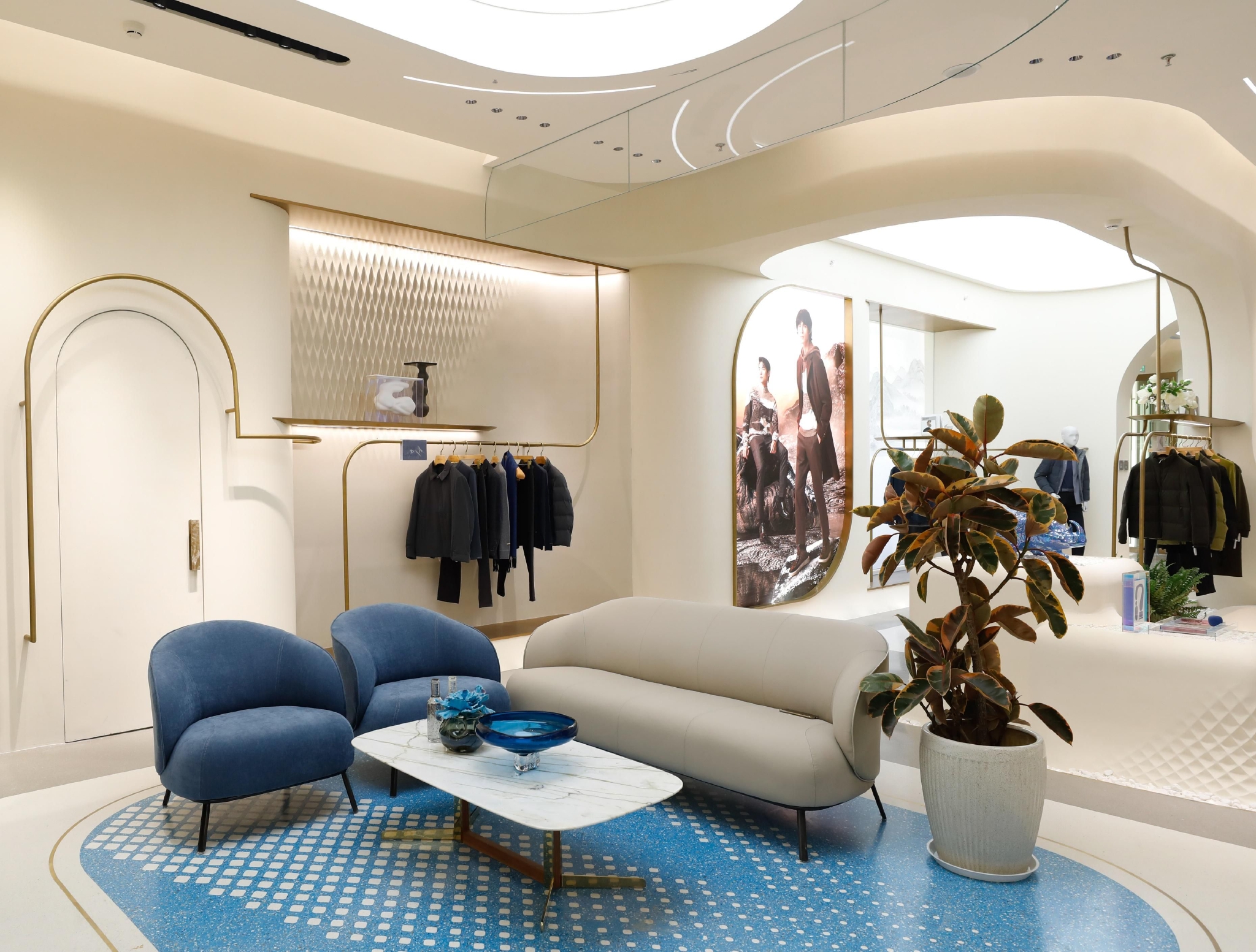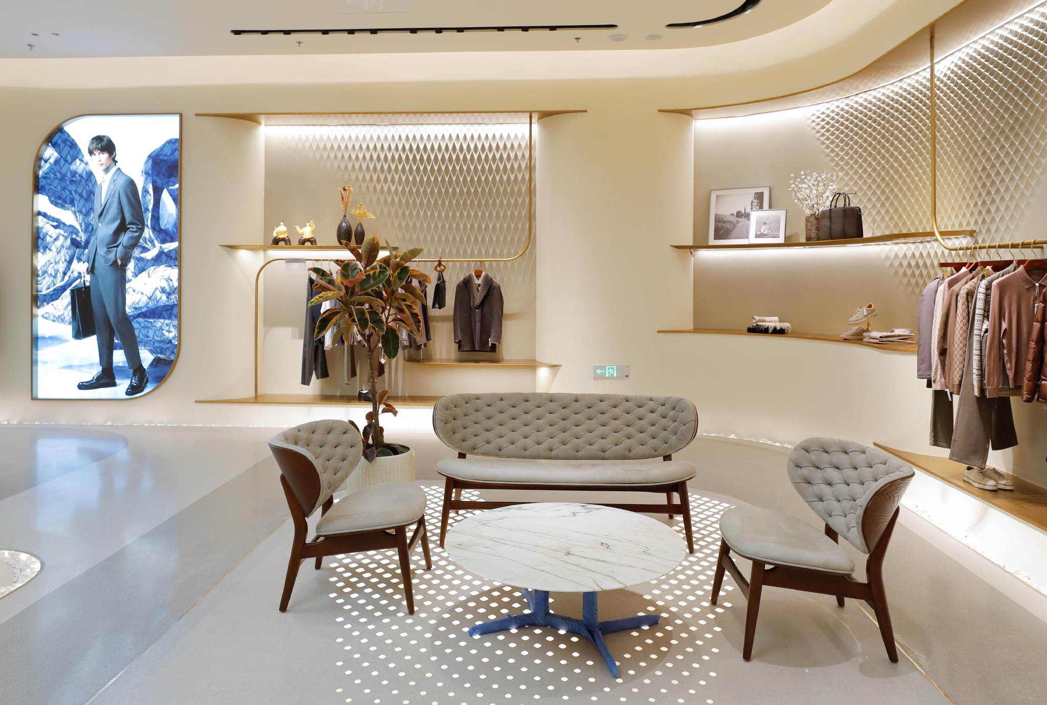 “V”形编织渐变元素嵌入到展示墙和休息区的地面,在店内随处可见,既是服装织物元素的演绎和升华,也是VICUTU威可多品牌的表达,为参观者打造沉浸式购物体验。