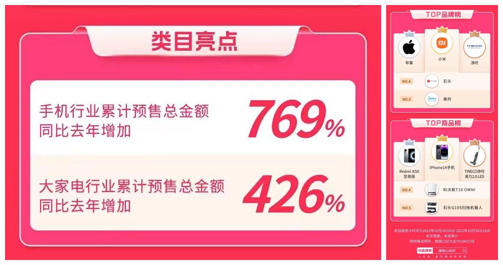 抖音双十一好物节消费电子家居生活行业预售期间,手机行业累计预售总金额同比去年增加769%,大家电行业累计预售总金额同比去年增加426%。苹果、小米、添可、石头、美的等众多品牌参与,成功打造多个爆款单品,获得生意新增量。其中,小米、苹果、添可更是登上品牌榜TOP3,iPhone14手机、Redmi K50、TINECO添可芙万2.0LED则登上商品榜TOP3。