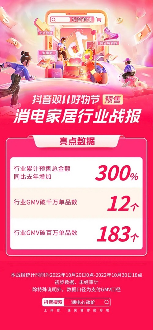 其中,消费电子家居生活行业在抖音双十一好物节期间,打造了行业特色日+4大垂类特色日,集合抖音商城玩法,重做家电、3C数码等强预售心智的标品预售。据统计,此次抖音双11好物节手机类目和大小家电全面爆发,涌现出超多千万、百万爆款单品。行业累计预售总金额同比去年增加300%,行业GMV破千万单品数12个,行业GMV破百万单品数183个。