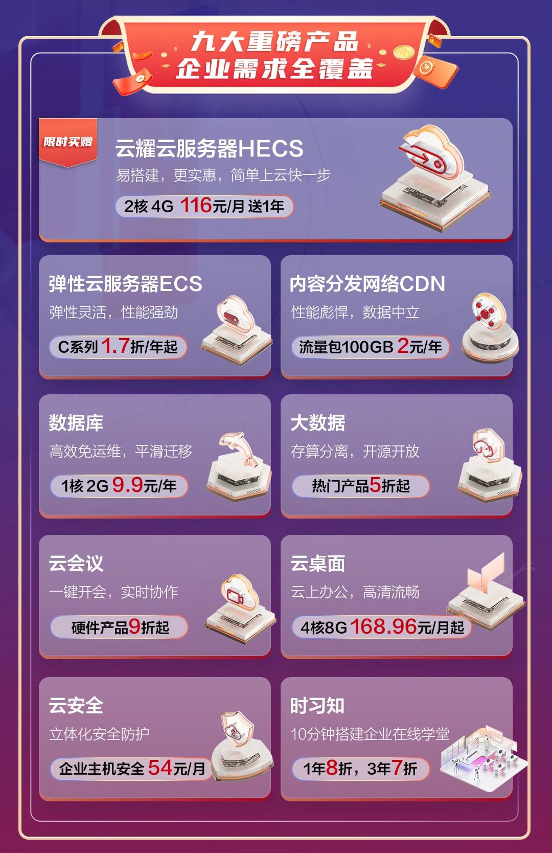 其中,在产品方面,让企业“简单上云快一步”的云耀云服务器HECS在双11期间推出限时买赠活动,2核4G仅需116元/月,买1月即刻送1年!弹性灵活、性能强劲的弹性云服务器ECS C系列1.7折/年起;具备高效免运维、平滑迁移等先进特性的数据库1核2G版仅需9.9元/年;可实现立体化安全防护的云安全将推出54元/月的企业主机安全特惠;华为云会议支持一键开会、实时协作,其硬件产品将以9折起的优惠价格提供给用户;存算分离、开源开放的大数据热门产品5折起;性能彪悍、数据中立的内容分发网络CDN将推出仅需2元/年的100GB流量包特惠;支持云上办公且高清流畅的华为云桌面,4核8G仅售168.96元/月;10分钟即可搭建企业在线学堂的“时习知”更是有1年8折、3年7折的优惠,多买多省。