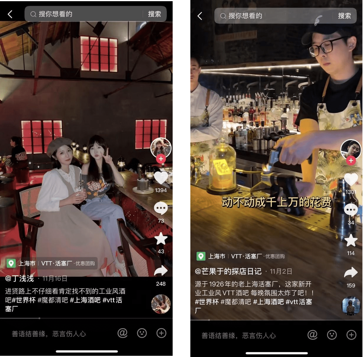 不出意料,球迷们面对今年的卡塔尔世界杯,同样爱去球赛文化浓厚的聚集地。这次在抖音生活服务「心动观赛季」活动中,位于上海的「VTT・活塞厂」酒吧就成为球迷的欢聚点。潮流达人们先行探店、直播,世界杯啤酒套餐、世界杯吉拉雪莉12年套餐、世界杯慕赫12年双瓶套餐等一大波价格让利的球迷观赛专属团品在直播间“甩”给球迷们。当球迷走进这家新晋时髦工业风的老酒吧,可以直接挑选酒吧推出的世界杯观赛季的活动专属组品,还可以享受酒吧在抖音直播购买的价格让利券、球迷观赛专属团品,并且还有机会参与「猜输赢」、「猜比分」、「猜冠军」等游戏,趣味十足。整个11月份,搭载世界杯玩法的「VTT・活塞厂」单月GMV增长309%,足见氛围对球迷们的重要意义。