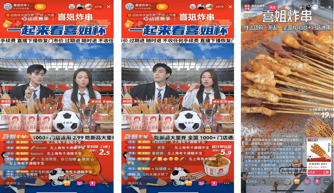 走进「喜姐炸串」的抖音直播间,不仔细看还以为是球赛直播。整个直播间背景采用了红色调后贴片和绿茵场设计,搭配“一起来看喜姐杯”谐音主题字幕,赛场氛围马上呈现。同时,重要的美食信息还通过模拟TV滚动展示,两位主播装扮成足球解说员,像解读足球赛事一样花式口播,让球迷们瞬间来了兴趣。当然,最诱人的还是在热油中翻滚的大块的鱿鱼、鸡块,主播在讲解团品时自由选取招牌产品进行特写展示,期间还穿插高清全屏炸串制作画面,清晰展现出食材用料干净卫生,经炸制后香嫩鲜滑,隔着屏幕都能嗅到那份沁香。当油滋滋、热乎乎的炸串摆在面前,优惠券实时派发,很难让人控制住抢券的欲望。正是这份对炸串的狂热,让「喜姐炸串」连续3天自播GMV累计突破了1000万,显然世界杯氛围下,炸串还是深受球迷们的喜爱。