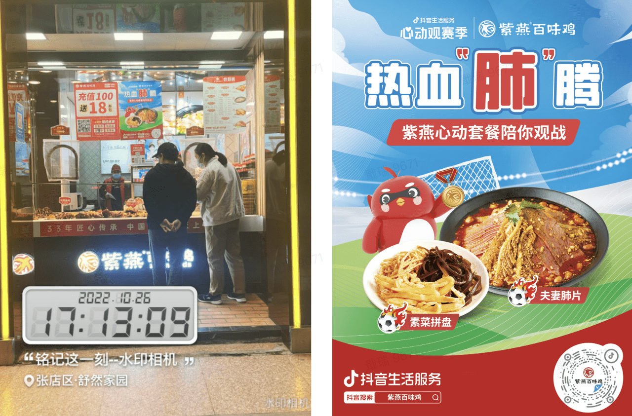 线上直播间热闹无比,线下街头弄巷也有与世界杯相关的美食。在抖音生活服务「心动观赛季」活动中,「紫燕百味鸡」迅速成为全国各地球迷打卡的标地。不少球迷看完达人短视频、直播“种草”,冲着他家的世界杯“热血肺腾”套餐而来,一个素菜拼盘+一个夫妻肺片,荤素搭配,再来点小啤酒,妥妥的观赛标配。如此诱人的套餐,让「紫燕百味鸡」从10月26日到11月21日观赛季期间,GMV就实现了740w,环比增长82%,可见是高度契合了中国球迷们的吃喝习惯:最快满足味蕾的幸福,一套熟食全搞定!