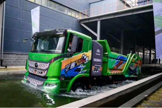 以往的宇通重卡产品在出厂前都要经过涉水测试,而在今天的极限挑战现场,宇通新能源重卡将展现行业内首次无改装素车在1.3m深的水中行驶100米,行驶过程中水浪最高可达1.6米!