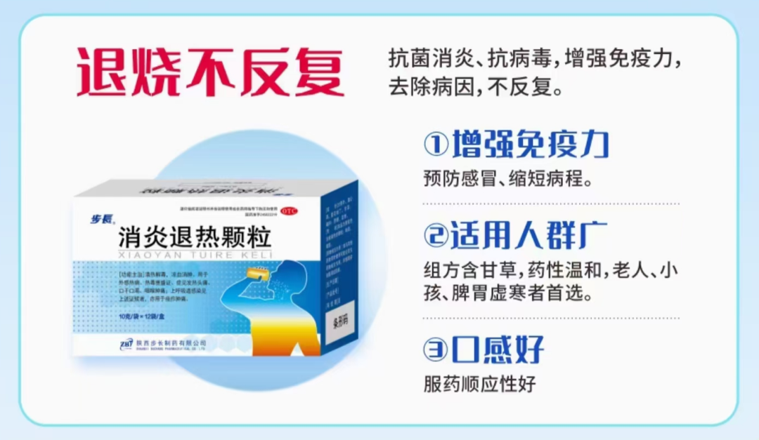 消炎退热颗粒由大青叶、蒲公英、紫花地丁、甘草四味中药精制而成。功能主治:清热解毒,凉血消肿。用于外感热病、热毒壅盛证,症见发热头痛、口干口渴、咽喉肿痛;上呼吸道感染见上述证候者, 亦用于疮疖肿痛。方中大青叶、蒲公英、紫花地丁清热解毒,凉血消肿,对于新冠病毒感染及普通感冒出现的发热、咽喉肿痛症状效果明显;同时方中含有甘草,药性温和,口感好,小孩、老人脾胃虚寒推荐使用。
