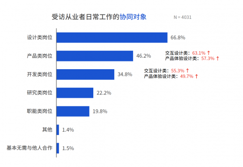 新兴设计人才的职能扩大,工作内容延伸至全流程用户体验工作,跨岗位协作沟通成为共识。据《白皮书》显示,98.5%的从业者日常工作中均存在与他人协作的情况。协作对象主要为其他设计类岗位、产品类岗位和开发类岗位。为了提升协同效率,大多数团队选择线上线下相结合的方式进行沟通。