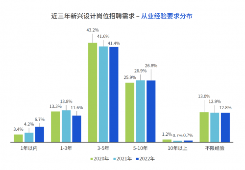 值得注意的是,产品体验设计岗位需求也在逐年增加。如今,企业越来越重视用户体验,产品设计需要充分考虑用户需求。过半企业开设独立用户体验部门或团队,其中,大型企业更加充实用户体验团队建设,希望能够通过专业化团队提升服务质量,打造更多“可用”、“好用”、“易用”的产品。