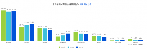 从岗位分布来看,视觉设计类岗位的招聘需求最为旺盛,连续三年需求占比均超过三成,当前企业的设计需求仍以平面设计为主。