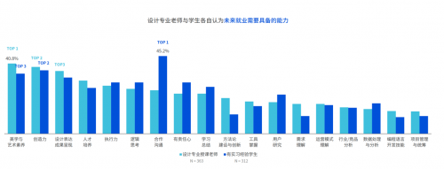 针对就业竞争力,设计专业的师生均认可“美学与艺术素养”、“创造力”的重要性。值得一提的是,近半数的学生表示,合作沟通已成为就业最需要具备的能力,这和当前招聘市场对设计人才的要求不谋而合。