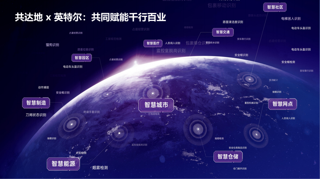 作为英特尔生态的一员,共达地与英特尔在产品、市场上开展了广泛而深入的合作。以提供强大的算力支撑,加速 AI 端到端的构建、训练、优化和部署为目标,双方充分利用英特尔至强可扩展处理器、英特尔视频AI计算盒、以及英特尔 OpenVINO 工具套件等软件工具,为企业与开发者提供了更易用、更流畅、更灵活的具备丰富 AI 功能的硬件基础设施。同时,双方强强联合,软硬一体,共同为客户提供一个端到端的AI-as-a Service, 直接对接到行业应用系统,共同赋能智能制造、智慧城市、智慧园区、智慧工业、公共安全、智慧交通、智慧城管等众多应用场景。