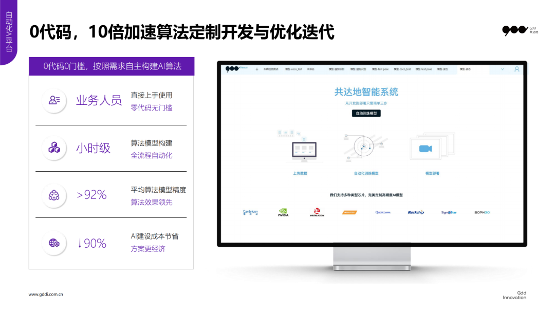 近年来,随着人工智能技术的进步以及算力成本的下降,人工智能与相关技术的协同规模化与产业化逐渐得到普及和提速。面向超大规模精细化的未来 AI 需求,共达地打造了自动化AI平台,基于领先的AutoML技术,以 0 代码自动化方式实现 AI 算法的训练、部署和迭代,极大提升了算法的生产效率,将单个算法交付周期从之前的6个月降低到1周;同时实现了“人人皆可AI”的算法生产模式创新,将算法生产门槛从依赖专业算法工程师团队降至1名业务经理或产品经理等非AI工程师按照需求可自主构建AI算法,且精度可媲美专业算法工程师。