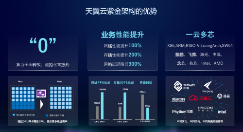 基于上述三大技术突破,天翼云紫金DPU算力体系架构相较于传统CPU算力架构,具备如下三大优势: