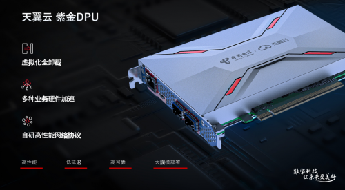 邵广禄表示,为了解决当前面临的问题,天翼云自主研发了基于紫金DPU的新一代云计算体系架构,实现对计算、网络、存储等算力资源的快速云化加速,具备高性能、低延迟、高可靠、可大规模部署的特点。基于天翼云全自研能力实现了虚拟化全卸载、多种业务硬件加速和自研高性能网络协议三大技术突破。