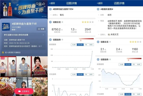 截至目前,活动在微博开启的#喜剧的喜聚##郎牌特曲为喜聚干杯#话题已超过3.7万人次讨论,阅读量2.97亿,抖音阅读量达到3.6亿。