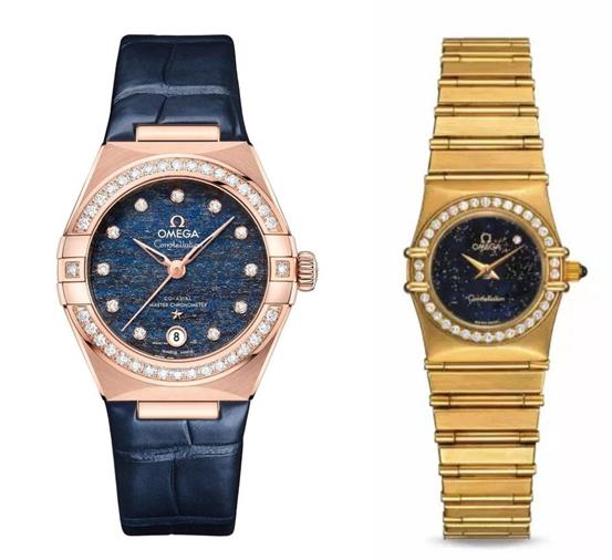 左:29毫米星座系列砂金石腕表;右:1992年的一款女士18K金星座腕表,表盘点缀星点并镶有钻石