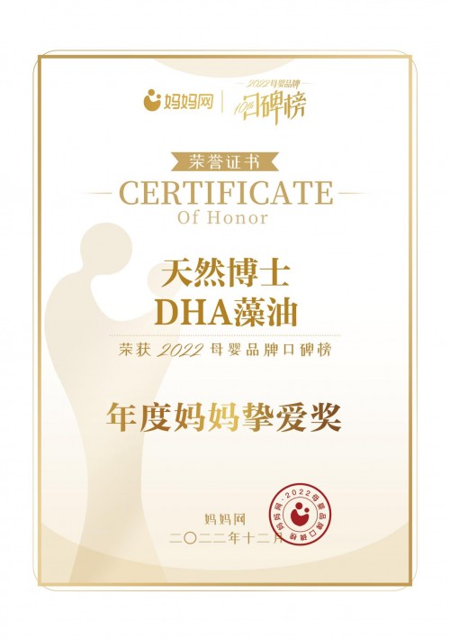 近日,妈妈网2022母婴品牌口碑榜五大榜单正式揭晓,亿万妈妈在线共同见证妈妈网口碑榜诞生的闪耀时刻。天然博士DHA藻油凭借卓越的品质和良好的用户口碑,斩获年度妈妈挚爱奖。