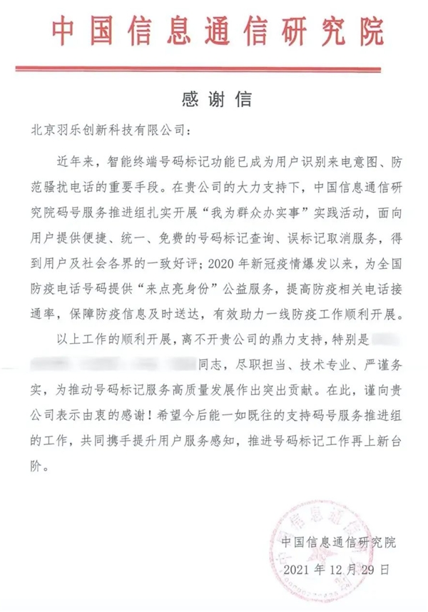 电话邦的公益举动多次收到权威部门的肯定,不但连续多年入围工信部“最具推广价值的防范打击通讯信息诈骗创新实践案例”,还荣获“码号卫士奖”、“2020年度ICT中国创新应用特别贡献奖”等权威肯定。并于2021年收到来自中国信息通信研究院的感谢信,为电话邦提供防疫公益技术服务表达了感谢。