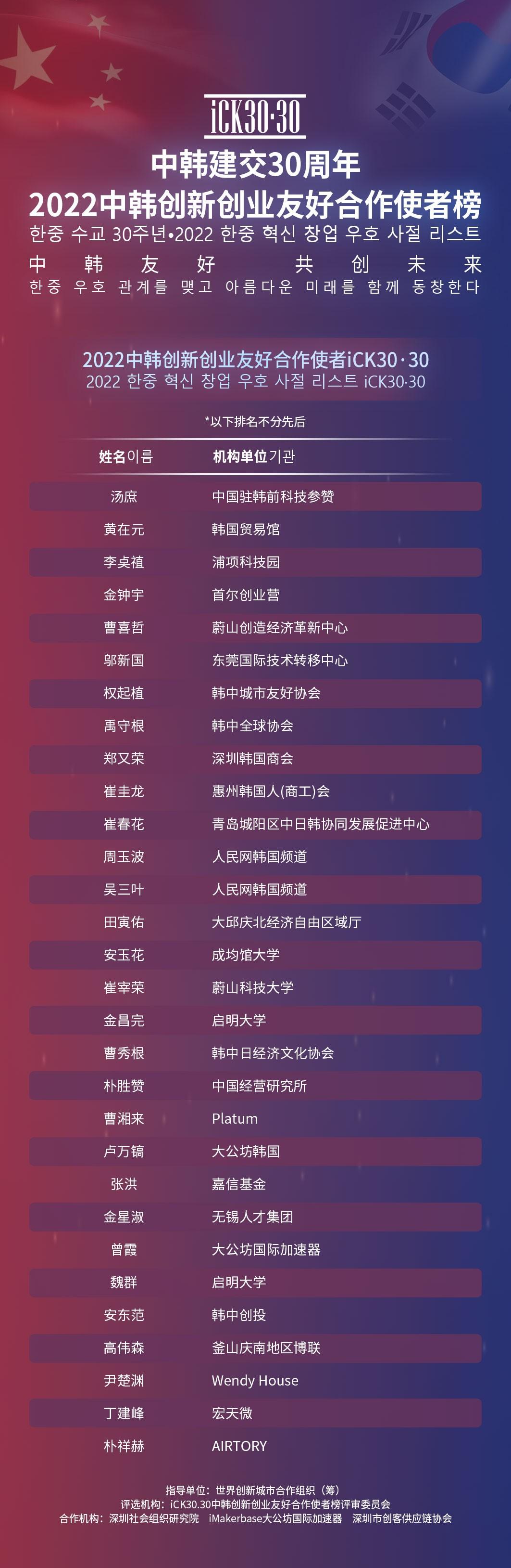 以下为2022中韩创新创业友好合作使者iCK30·30完整榜单
